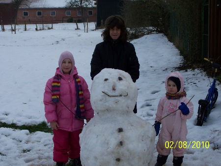 Meine Frau mit Kinder beim Schneemann bauen.